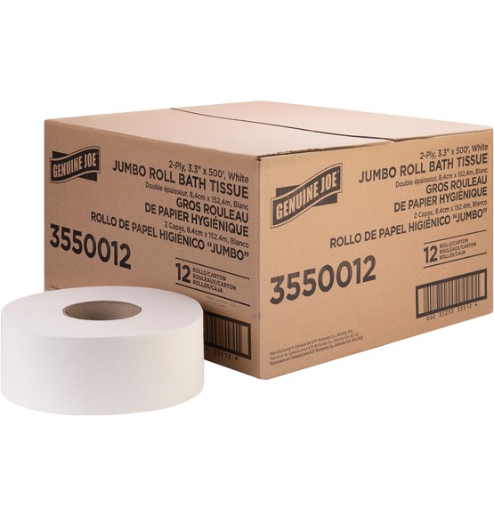 | Marketing Information | This jumbo roll of two-ply bathroom tissue satisfies everyday needs. Made from a high percentage of recycled fiber, it exceeds EPA comprehensive procurement guidelines. This bathroom tissue is cost-effective solution for all areas and is safe for sewer and septic systems. It fits in bathroom tissue dispensers that hold a 12" diameter roll. |