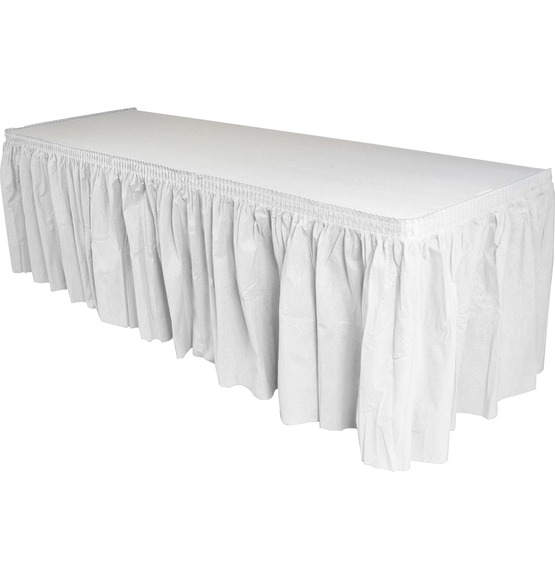 | Marketing Information | Table skirting is made of soft, nonwoven polyester for an elegant look. It feels like linen. Pleated skirt features self-adhesive backing for easy setup. |