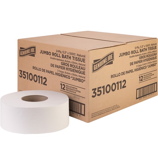 | Marketing Information | This jumbo roll of two-ply bathroom tissue satisfies everyday needs. Made from a high percentage of recycled fiber, it exceeds EPA comprehensive procurement guidelines. This bathroom tissue is cost-effective solution for all areas and is safe for sewer and septic systems. It fits in bathroom tissue dispensers that hold a 12" diameter roll. |