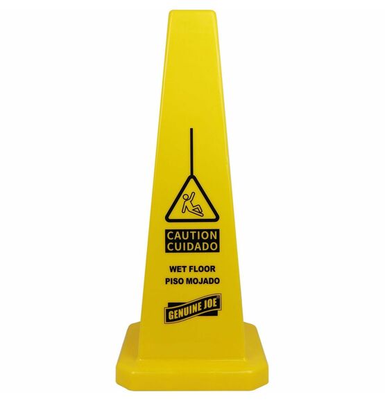 | Marketing Information | Warn others to proceed with caution with this highly visible, bright yellow, four-sided safety cone. All four sides contain the warning message in English, Spanish and ANSI symbols for effective communication to broad audiences. The cone's shape allows efficient stacking when not in use. Safety cone is made of tough polypropylene to withstand use in harsh industrial environments. |