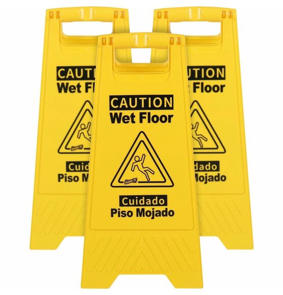 | Marketing Information | Wet floor sign features both English and Spanish warnings for more effective communication. Bright color with bold, dark letters is highly visible to be easily recognized from a distance. Universal wet floor graphic provides further acknowledgment of caution. Sign conveniently folds flat for space-saving storage and easy transportation. |