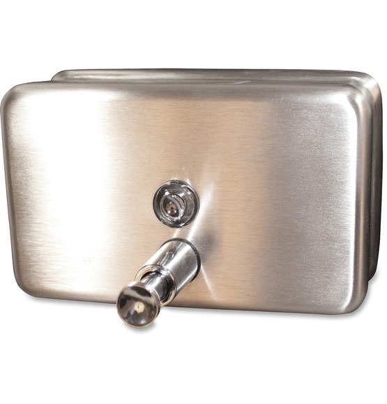 | Marketing Information | Horizontal soap dispenser features a theft-proof construction to prevent tampering. Stainless steel body features smooth, rounded edges that can be easily cleaned for sanitary use. 40 oz. tank features a top-fill design for quick, simple refills. Soap dispenser is designed for use with liquid and lotion soaps (sold separately). |