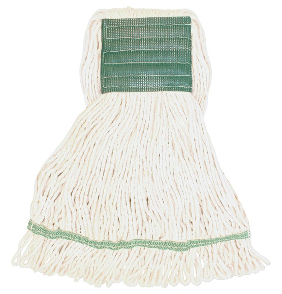 | Marketing Information | Medium-size mophead with a wide headband is ideal for general cleaning and disinfecting. Synthetic blend fibers (rayon and cotton) absorb six to seven times their weight. Mop offers a limited break-in period so you can start mopping sooner. Looped ends provide greater durability and launderability. Wide headband allows added launderability and use with all handle styles. 5" mesh headband with "S" zig-zag stitch pattern provides a more durable headband. |